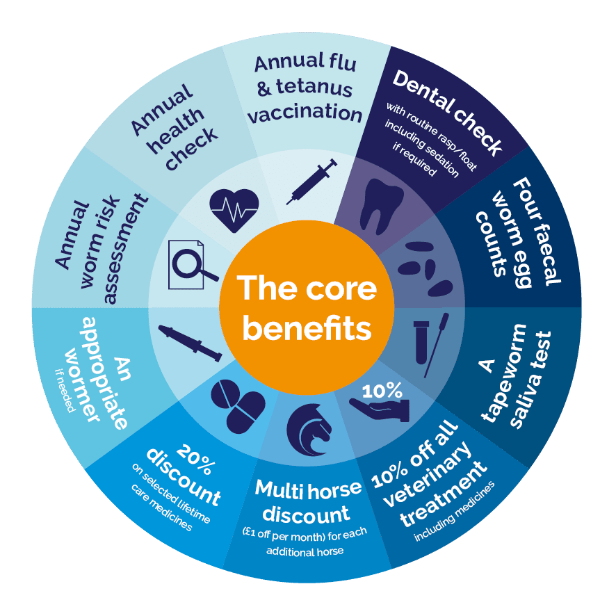 Our health plan has been carefully designed with the cost conscious owner in mind enabling you to budget for your horse’s care by spreading the cost of preventive health treatments over 12 months. The programme offers further discounts including 10% off all veterinary treatments and 20% off selected lifetime care medicines.